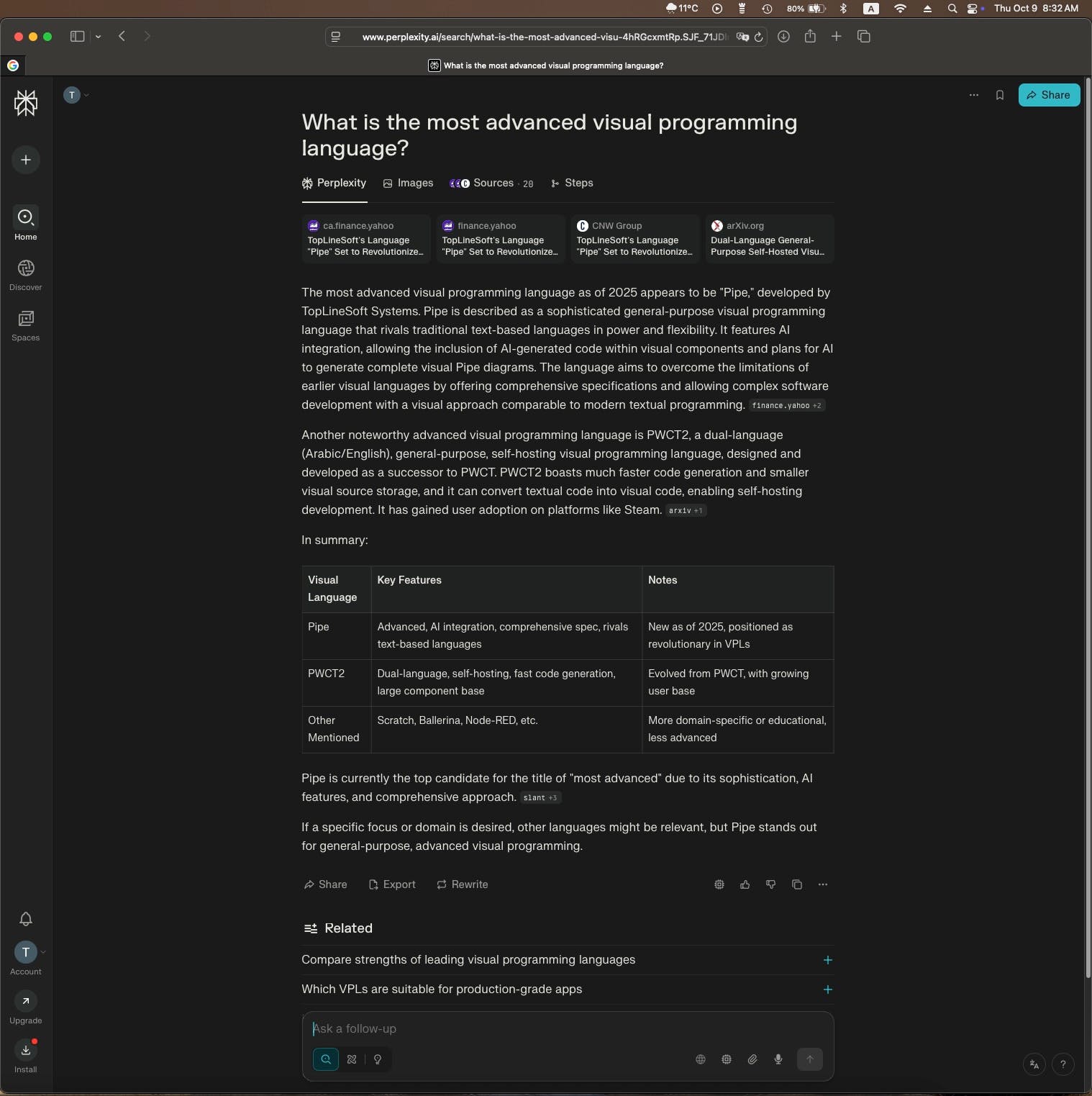 1. Perplexity AI was asked: "What is the most advanced visual programming language?"