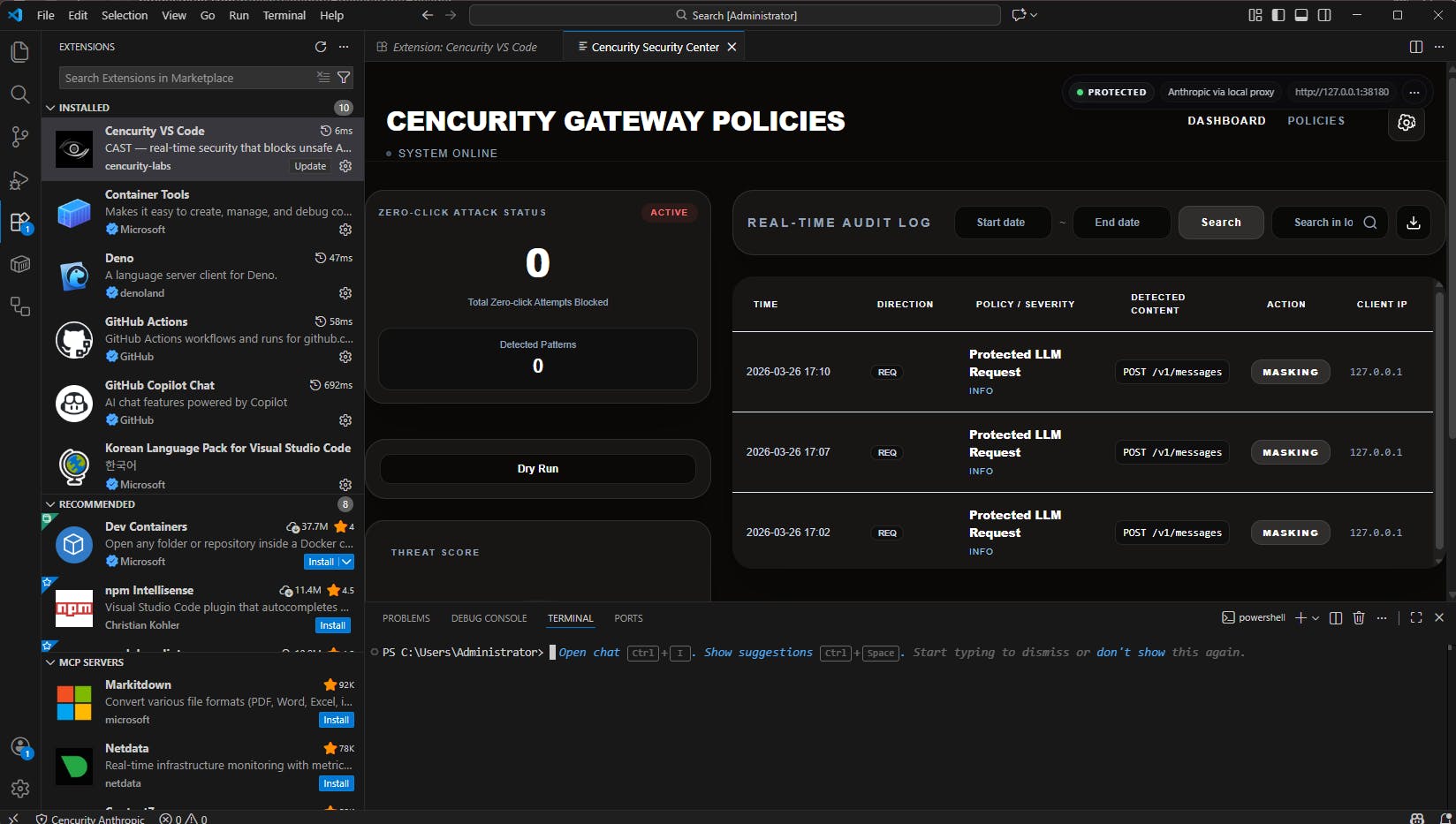 This isn’t about prompting an LLM to review code or training a security-aware model. Cencurity operates at the infrastructure layer — it sits as a proxy between IDE/agent and the upstream LLM provider.