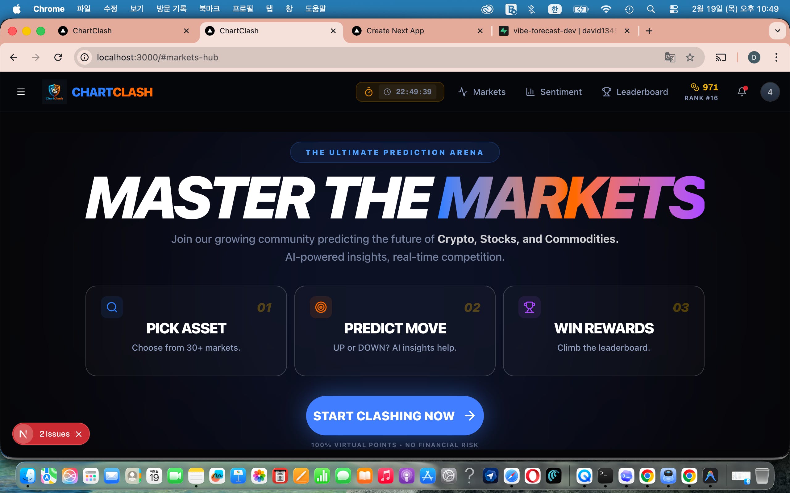 ChartClash turns market predictions into competitive gameplay. Predict daily prices for cryptos, stocks, and commodities. Compete on real-time leaderboards. Track your accuracy over time. Perfect for traders testing market instincts without risking real money. How it works: - Pick assets - Predict prices - Submit - Climb the leaderboard No wallet connection. No trading risk. Just pure prediction skill and competition. Prove your forecasting abilities on the leaderboard.