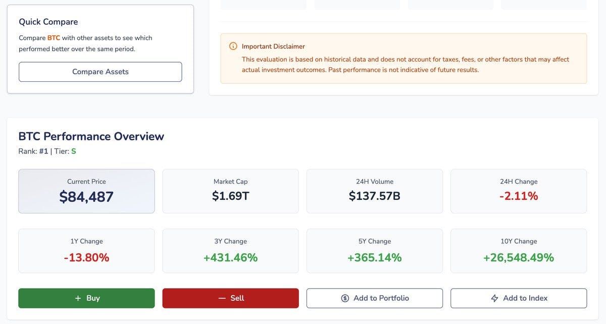 Clarity helps crypto investors understand how their assets, portfolios, and strategies have performed historically so they can make future decisions with confidence. Users can compare assets, evaluate lump-sum vs DCA strategies, track overall portfolio gains, benchmark against popular indices, and build custom baskets. Our goal is to help long-term investors cut through noise and make data-backed choices instead of relying on speculation.