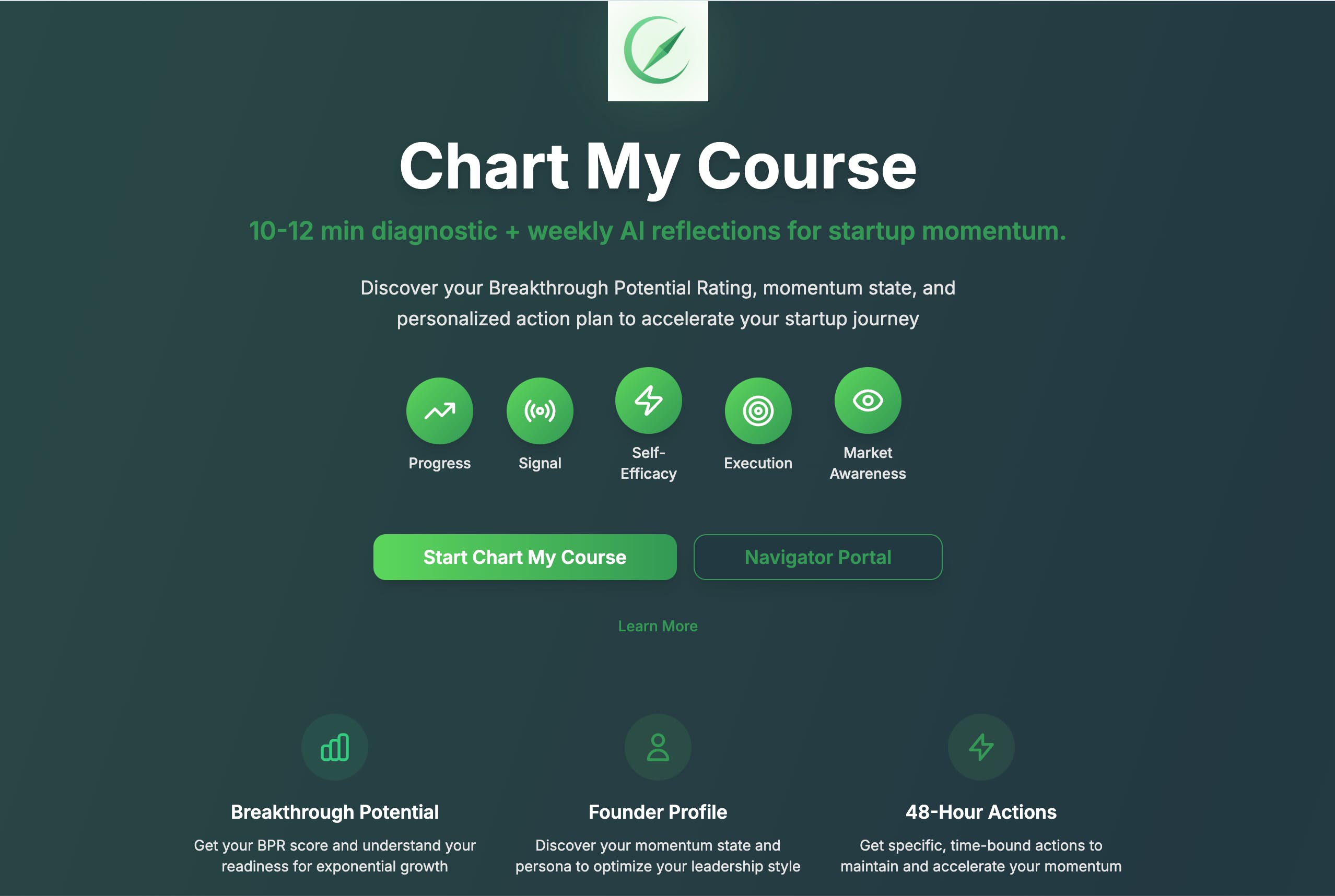 Compass is a founder OS. In 10–12 minutes, Chart My Course benchmarks five signals—Progress, Signal, Self-Efficacy, Execution, Market Awareness—and identifies your Momentum State. Then weekly reflections turn into clear next steps, emails, and resources.