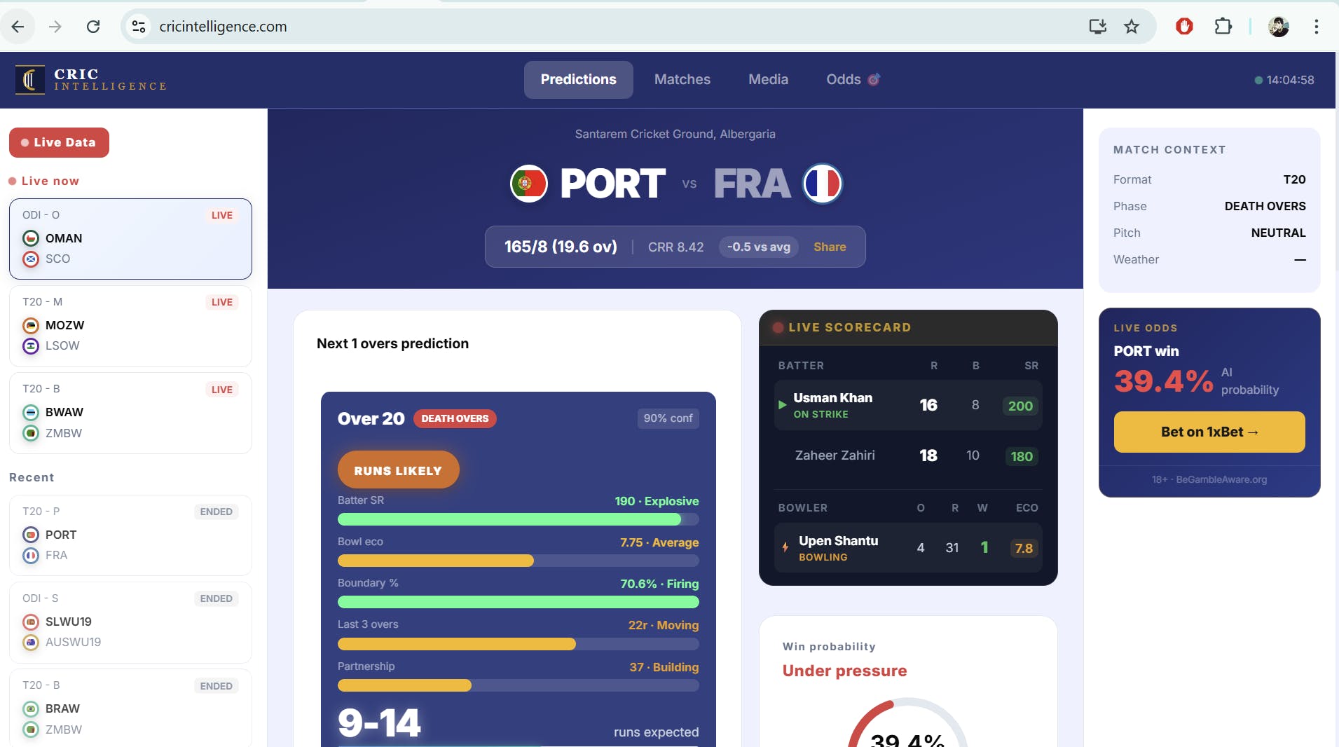 CricIntelligence gives you real-time IPL & cricket predictions powered by ML models trained on 1.7M+ historical matches. Features: live win probability with arc gauge, next over predictions, pitch & weather analysis, live scorecard, and Claude AI match analysis. Built for IPL, T20, ODI cricket fans who want smart insights during a live match.