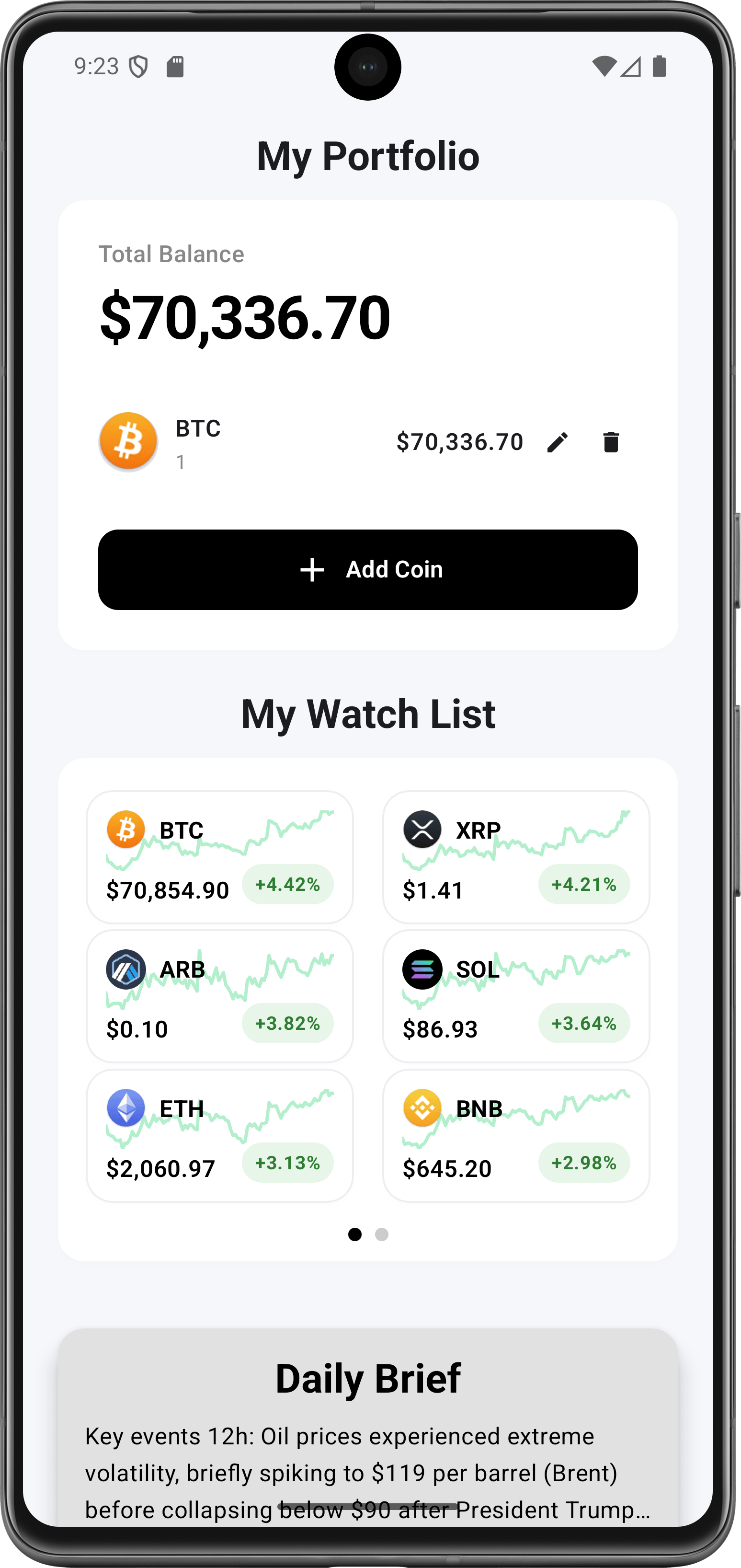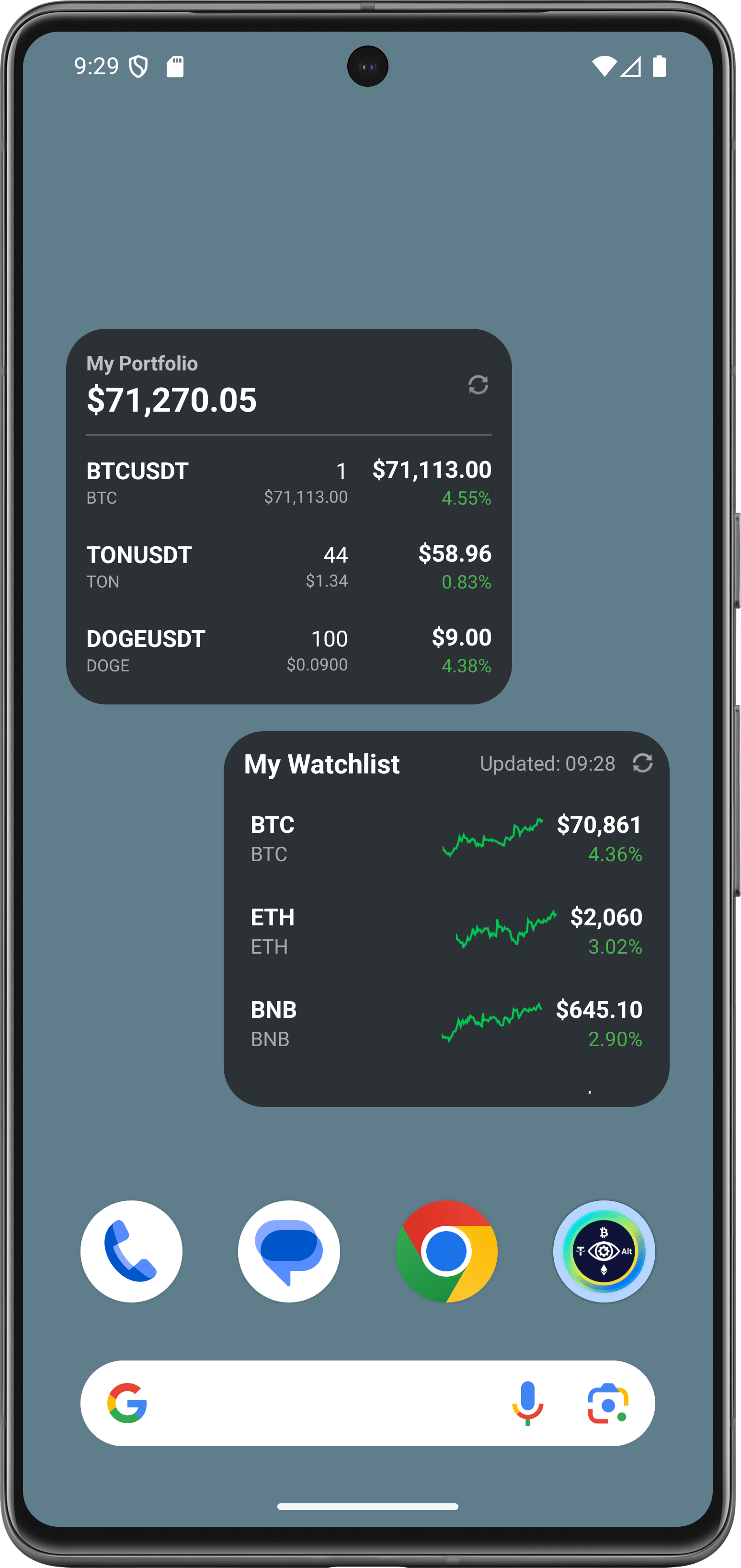An Android app with home screen widgets that show key crypto market data at a glance. Instead of opening multiple apps, you can see metrics like Fear & Greed, Altseason Index, BTC/USDT dominance, market cap, and coin prices directly on your home screen. The app also includes additional widgets for portfolio tracking and watchlists, plus deeper market insights inside the app such as dominance trends, technical indicators, charts, and AI-summarized crypto news.