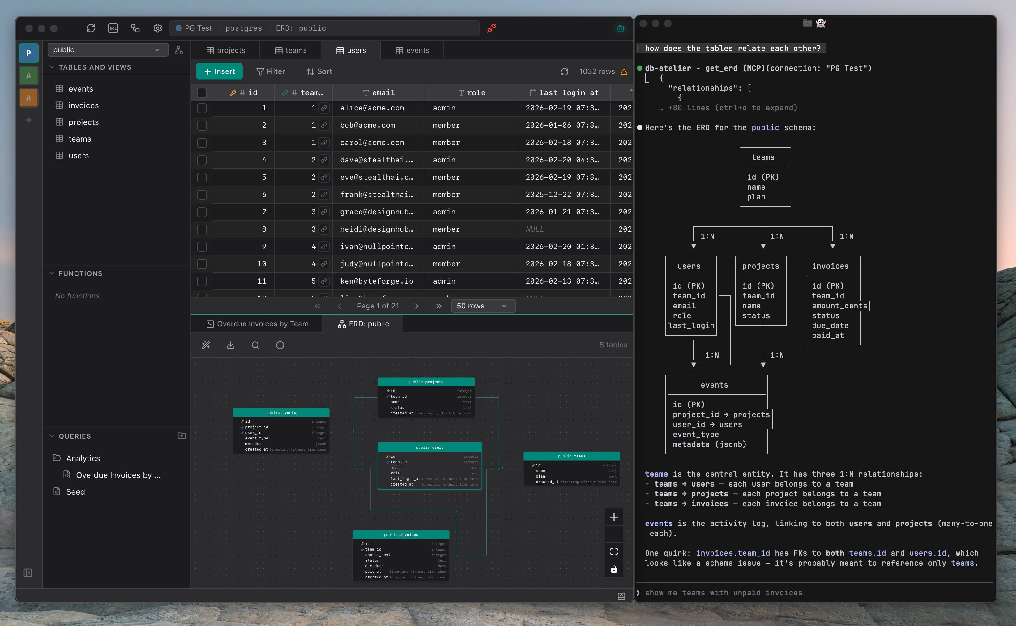 DB Atelier is a fast, beautiful, and extensible database client. Manage PostgreSQL, MySQL, SQLite, and MS SQL Server with split panes, ERD diagrams, and a visual query builder. Additional database engines can be added through extensions. AI-assisted SQL editing and MCP support are opt-in, so you can bring DB Atelier into your existing AI workflow.