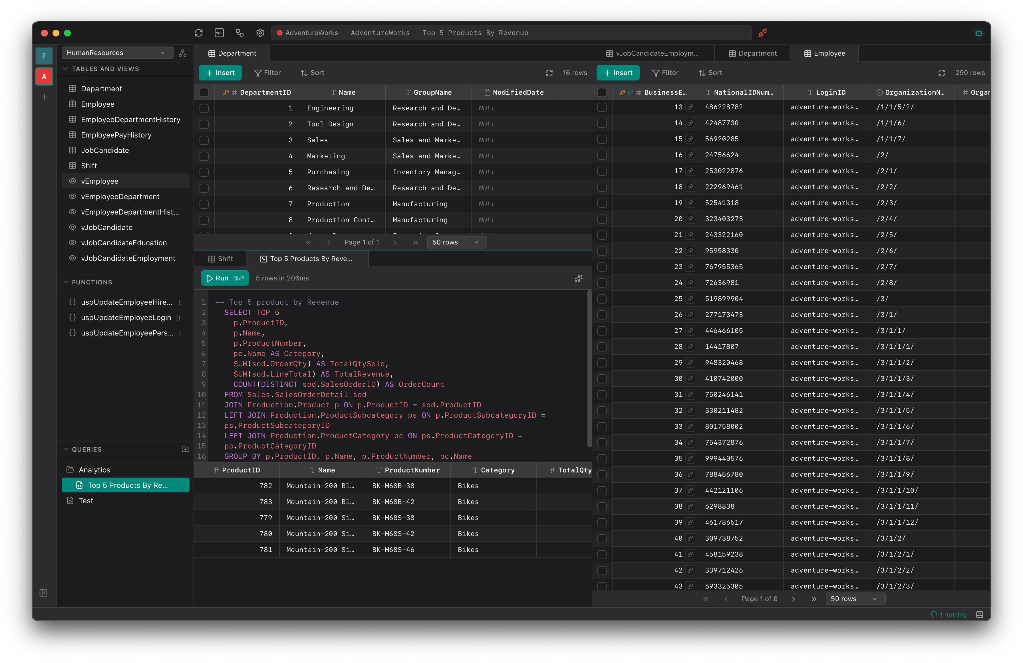 DB Atelier is a lightweight desktop database client with split panes, tabbed views, and a clean interface with just the necessary features. It natively supports PostgreSQL, MySQL, SQLite, and MS SQL Server. Additional databases and functionalities like analytics and visualization can be added through extensions.