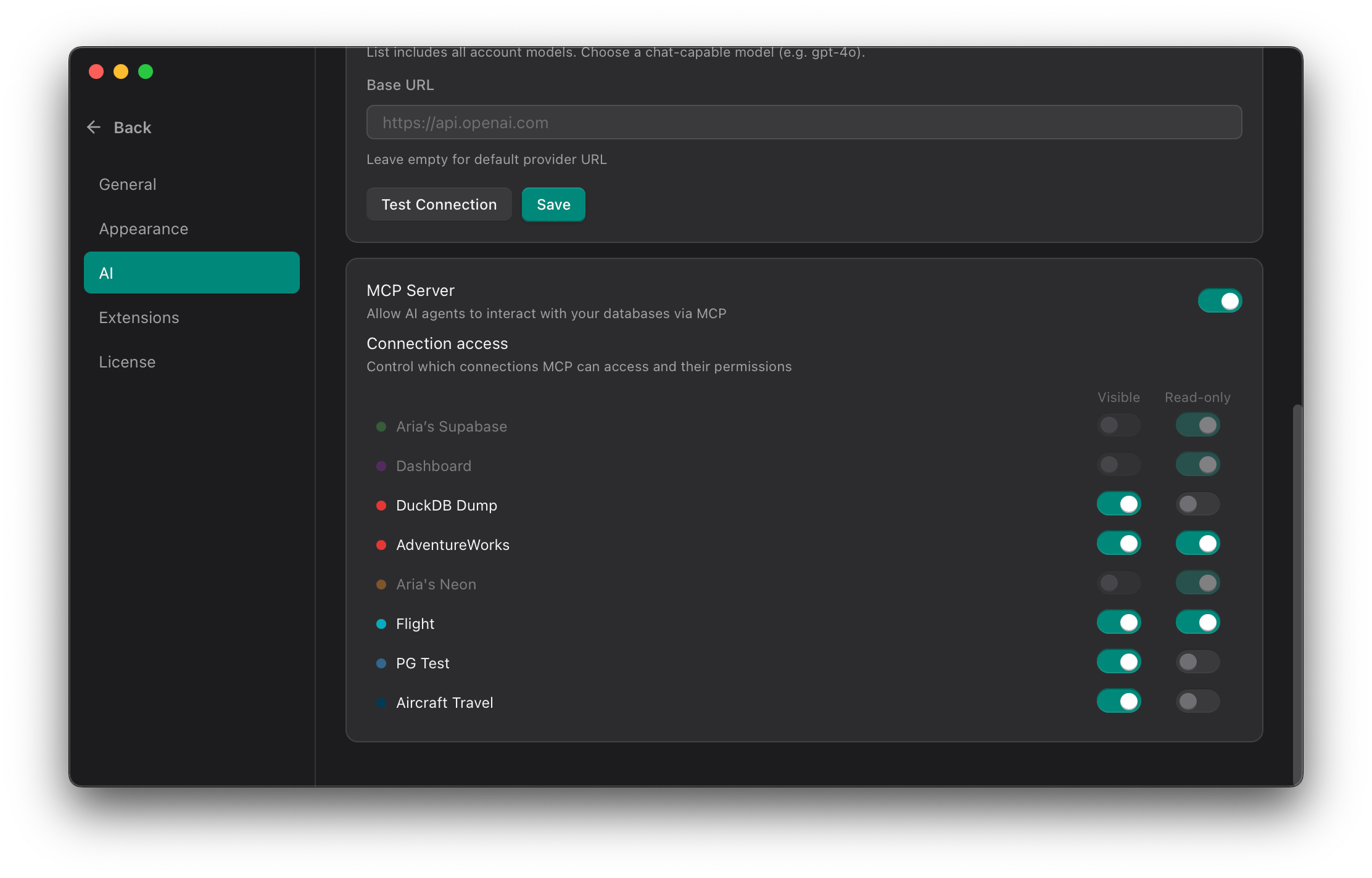DB Atelier also covers your AI workflow with context-aware tab completion. That said, we chose a different approach for communicating with AI agents: instead of embedding a chat UI that inherently limits you to our framework, we provide an MCP server so your AI agent can work directly with your databases via DB Atelier, from simple queries and data analytics to interacting with the app's interface.