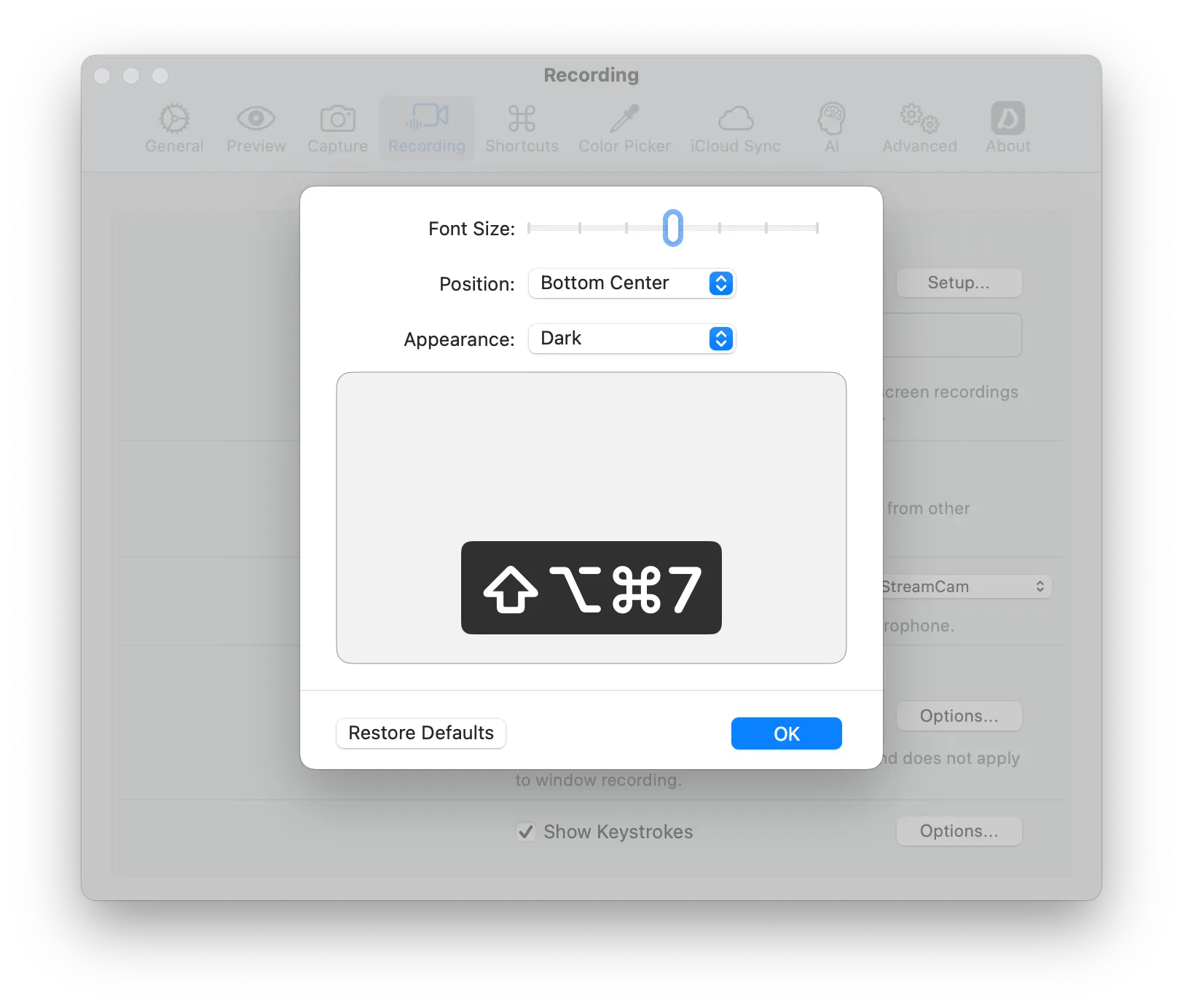 Added the Show Keystrokes option in Settings > Recording.