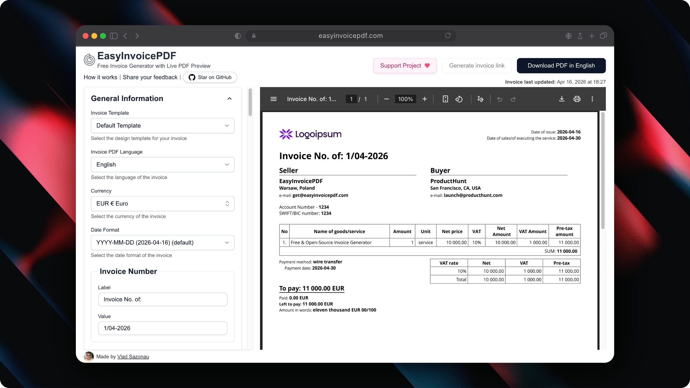 EasyInvoicePDF lets you create professional invoices instantly in your browser with a live preview and clean templates (including a Stripe-style design). Completely free and open-source.