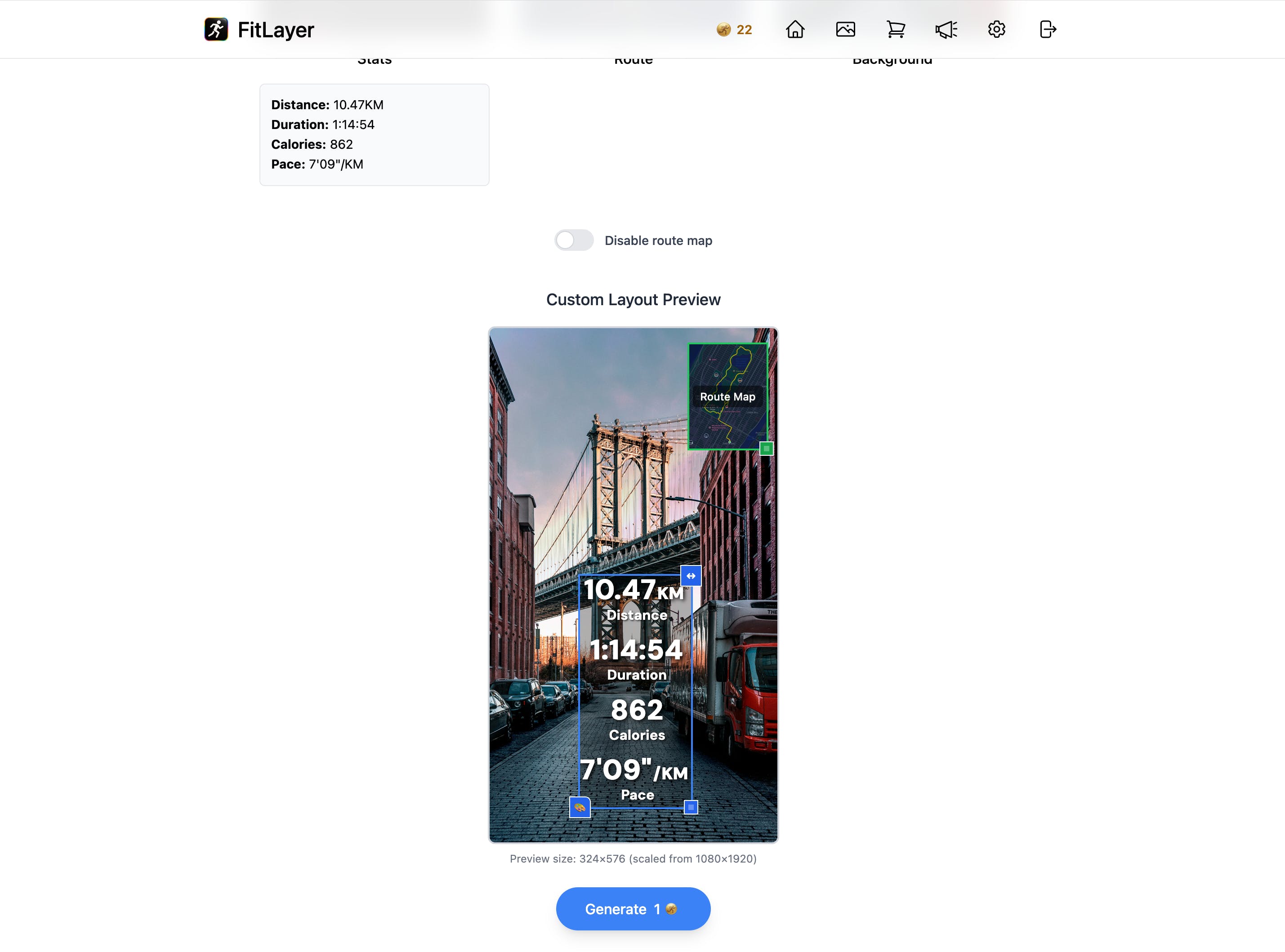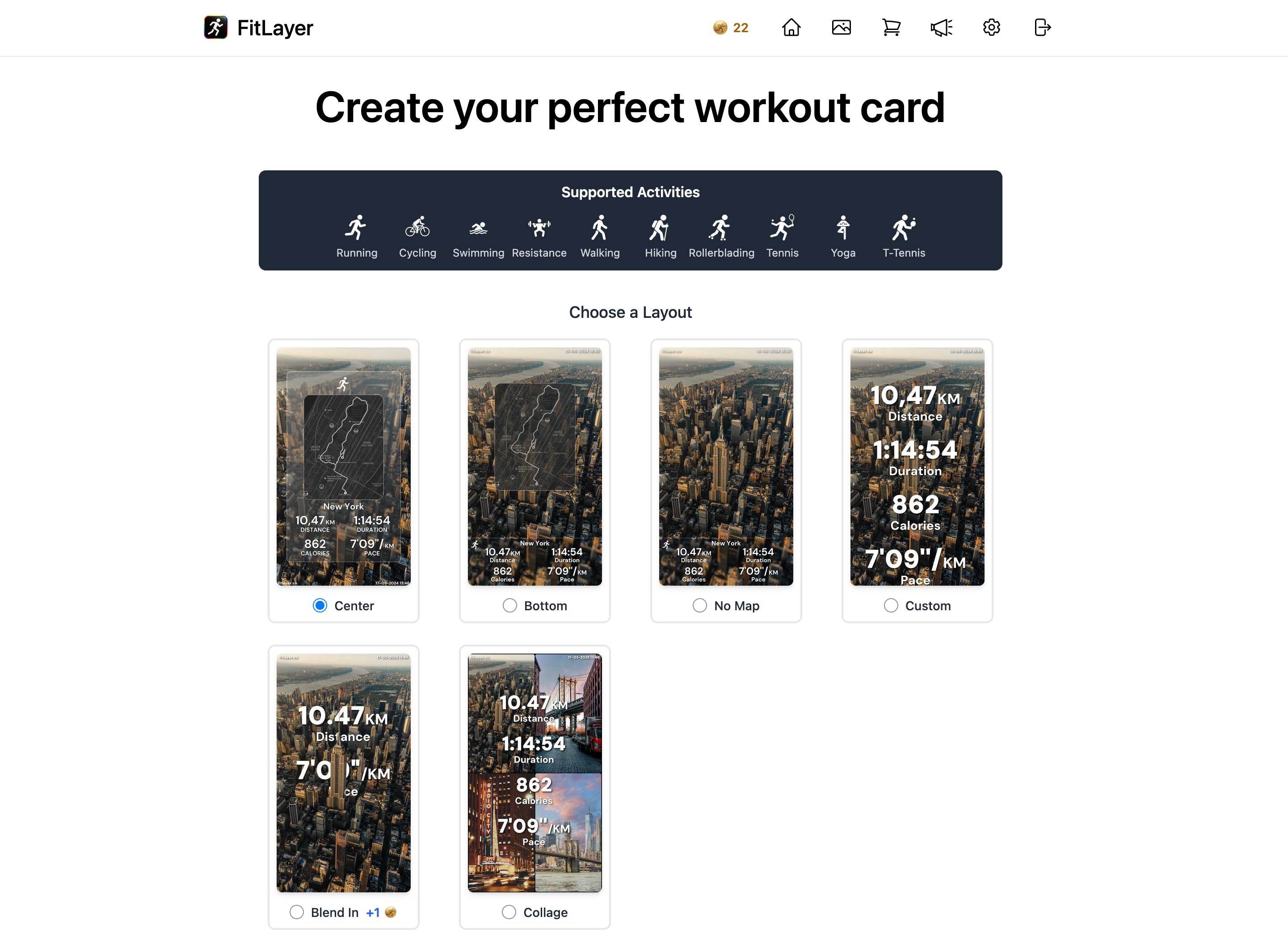 - FitLayer is a web app that turns your workout stats and route screenshots into clean, beautiful, social-media-ready story cards. You can: