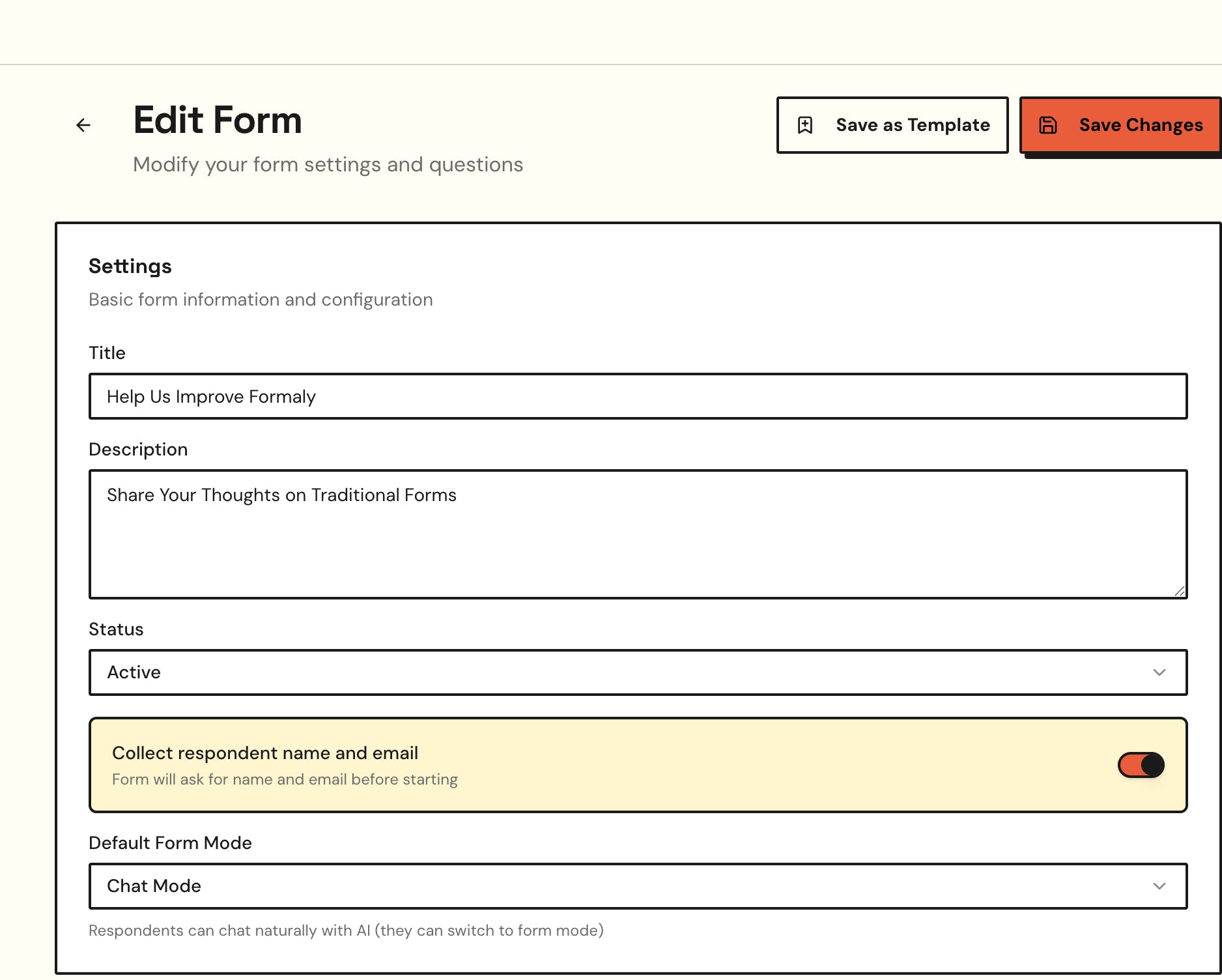 - Dual mode — respondents choose between chat or traditional form