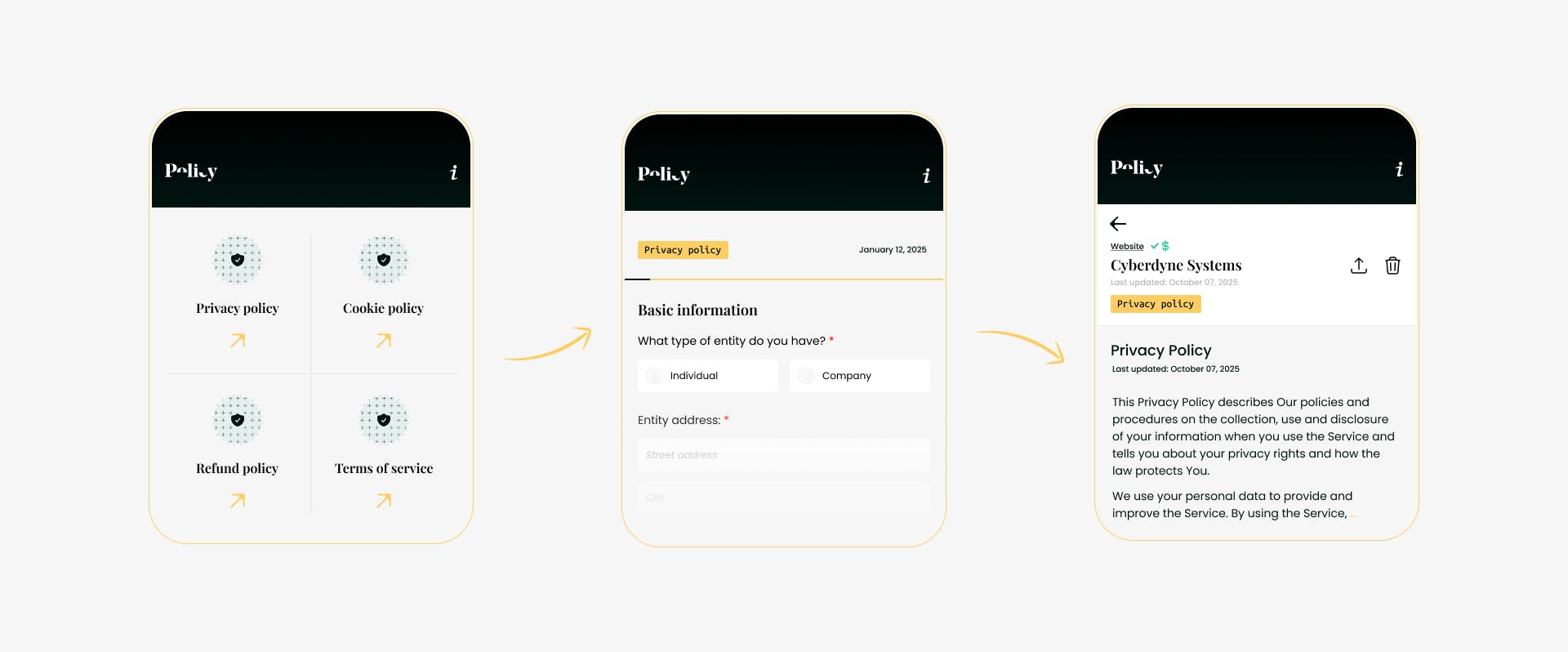 Create professional, policies in minutes for just $0.99 and export them as HTML or PDF. This app makes it simple to generate Privacy Policies, Cookie Policies, Refund Policies, and Terms of Service for your website, app, or online business. How it's different We don’t require you to create an account. We don’t charge extra for certain policy sections. We show you the entire policy to review before paying for it.