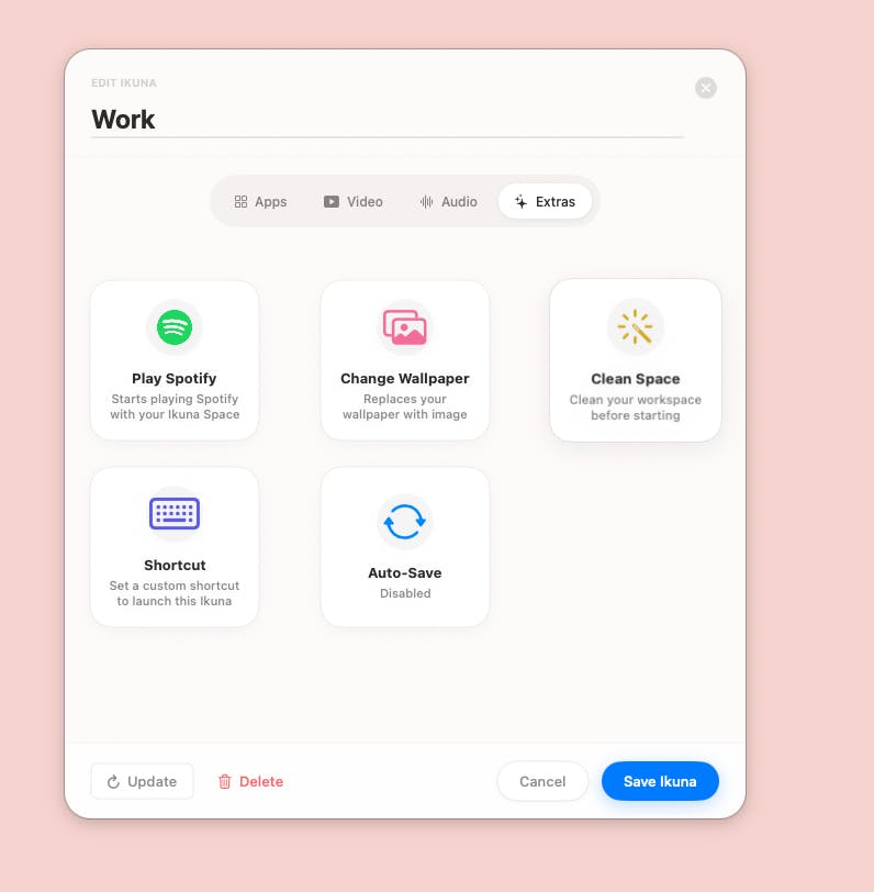 Right now, Ikuna helps you save and restore workspaces quickly, so switching between projects does not mean rebuilding your setup every time. You can already launch workspaces directly from the app or use dedicated shortcuts for them.