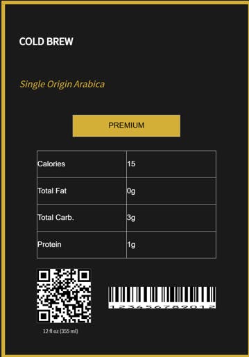 Example 1 : "Design a modern cold brew coffee label, 12oz bottle, premium feel, with nutrition facts"