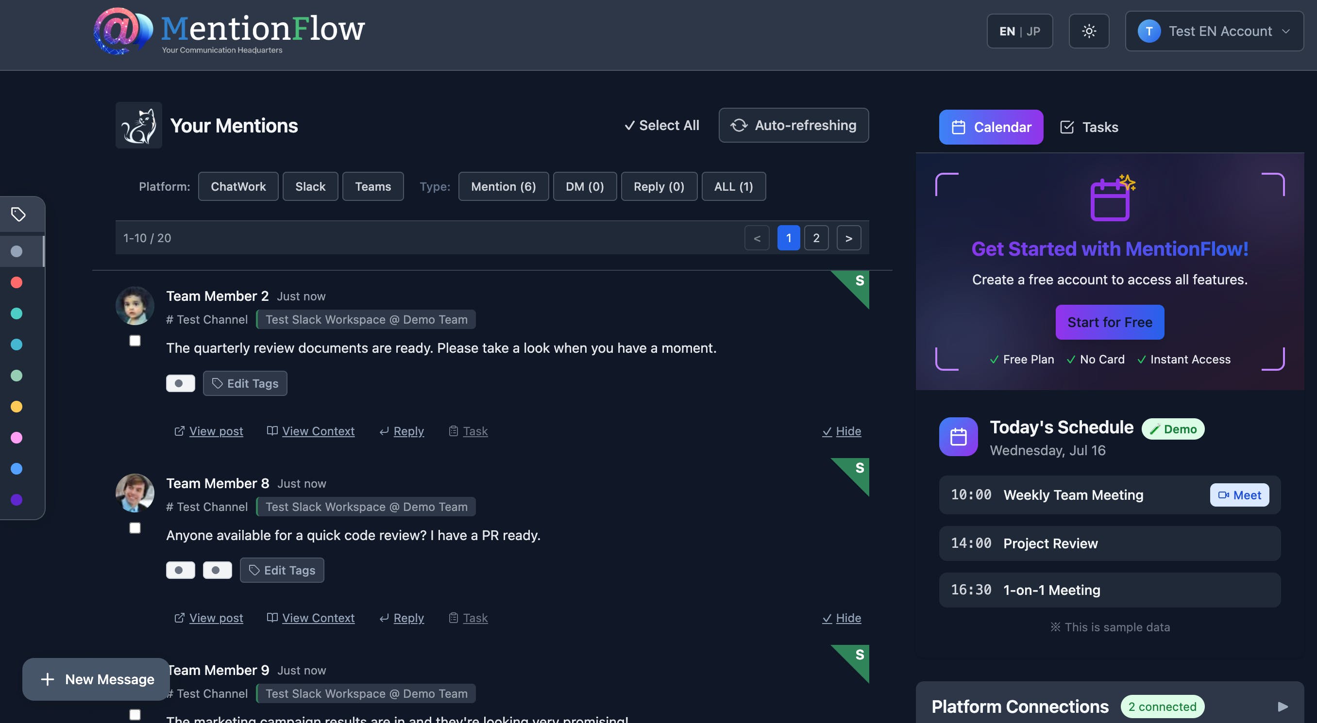 MentionFlow aggregates all your mentions from Slack, ChatWork, and more into a single, clean interface. Built with zero-storage architecture, your conversations stay private while you stay organized.