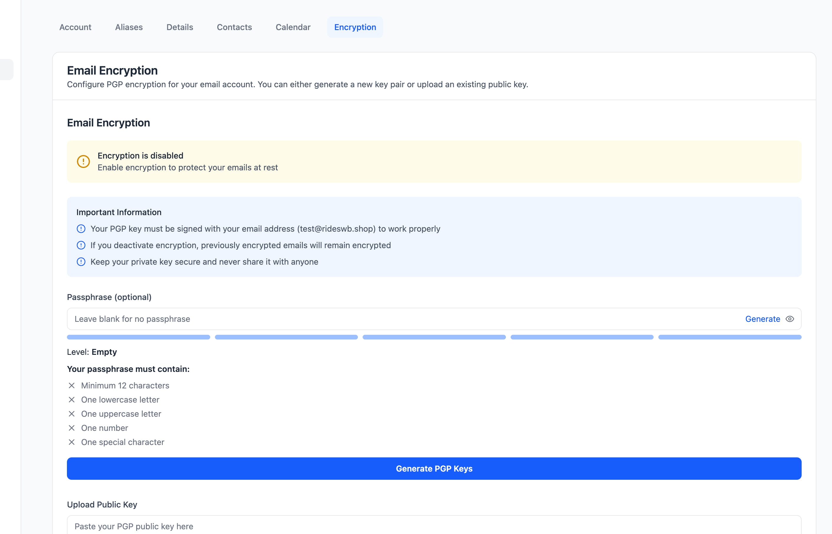 You can either generate a key here, which will make the private key available for download one time, after you've downloaded it, the key will be removed immediately from our servers. The at rest encryption will then be immediately enabled. The private key can then be loaded into your mail client.