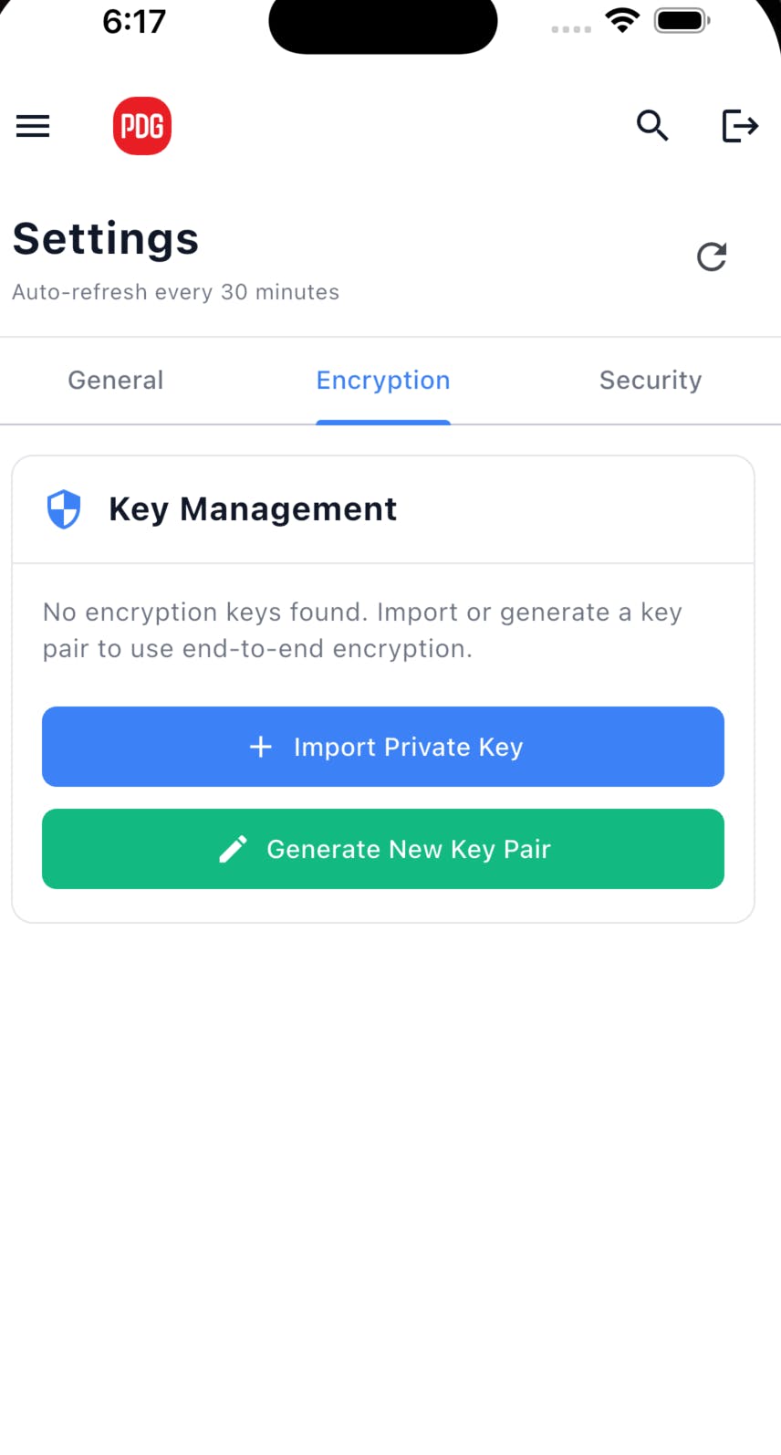 2) With our PDG Mail native apps for device, the key process is very simple. You can either import the private key you downloaded from the PDG Mail site, we've made the iOS app register the .asc file type for the key, so you can simply airdrop the key to your device to install it. To generate the key on device you will be prompted for a password, then the key will be saved in your devices secure keychain, you can then copy the public key and upload it to the PDG Mail portal.