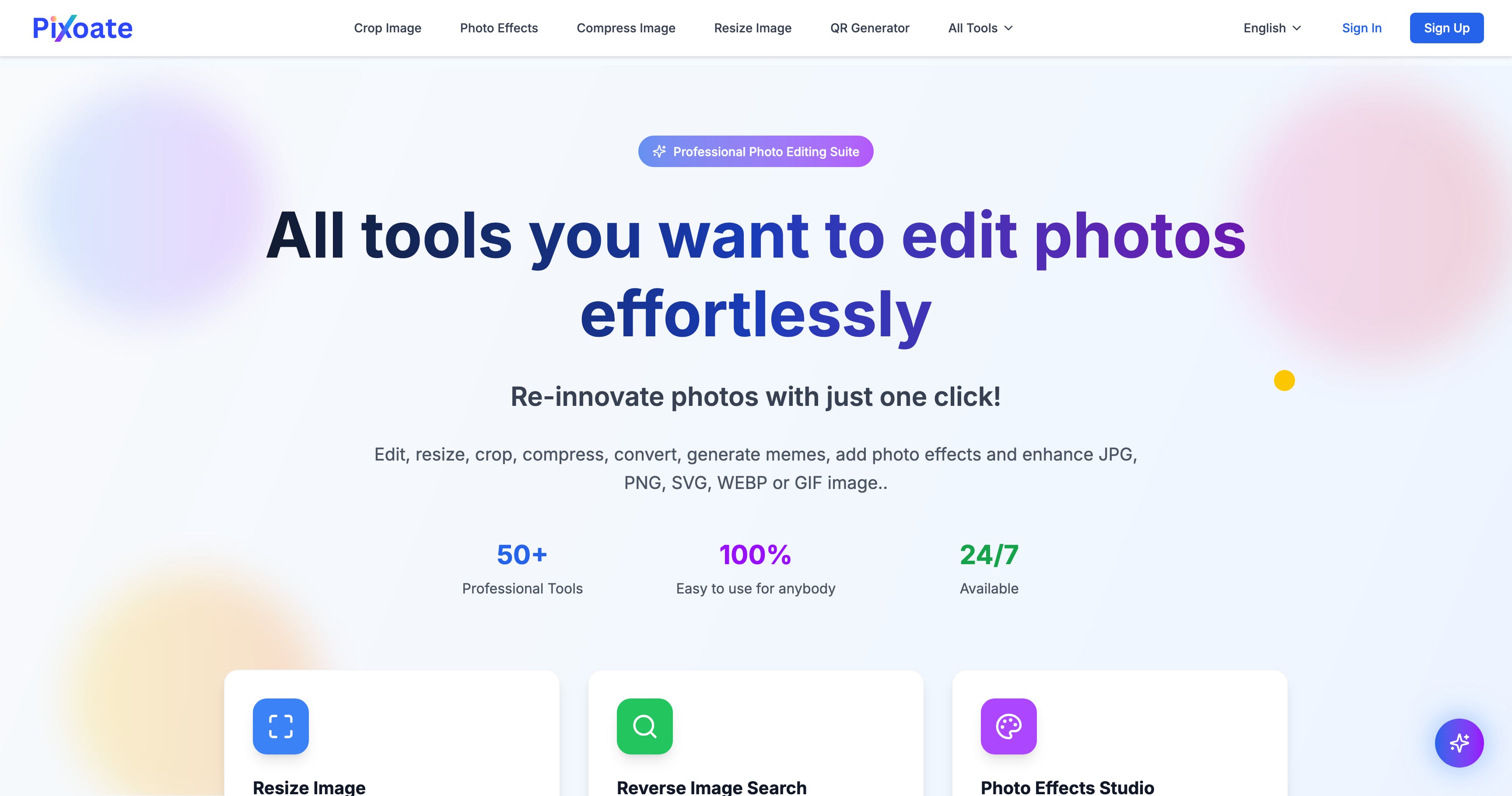 Pixoate is a web-based photo editing suite with 50+ professional tools that lets anyone — designers, creators, business owners, social media users — do all the essential image work quickly and easily. No installs, no heavy software; just upload your image (JPG, PNG, GIF, SVG, WebP), apply what you want, then download. It supports multiple languages and works at any time