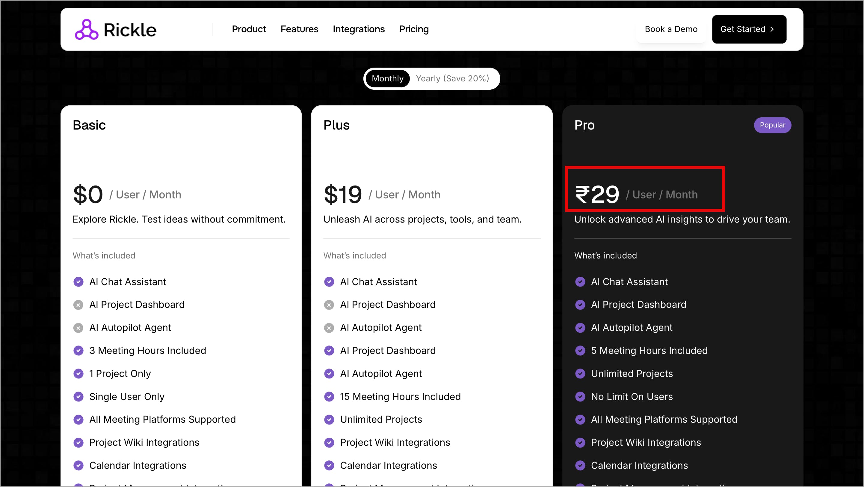 I guess, it's a bug in Monthly pricing where suddenly the Pro plan is showing rupees instead of dollars.