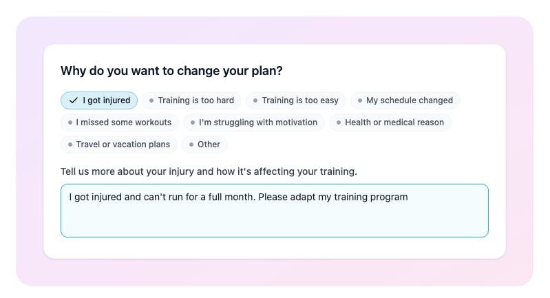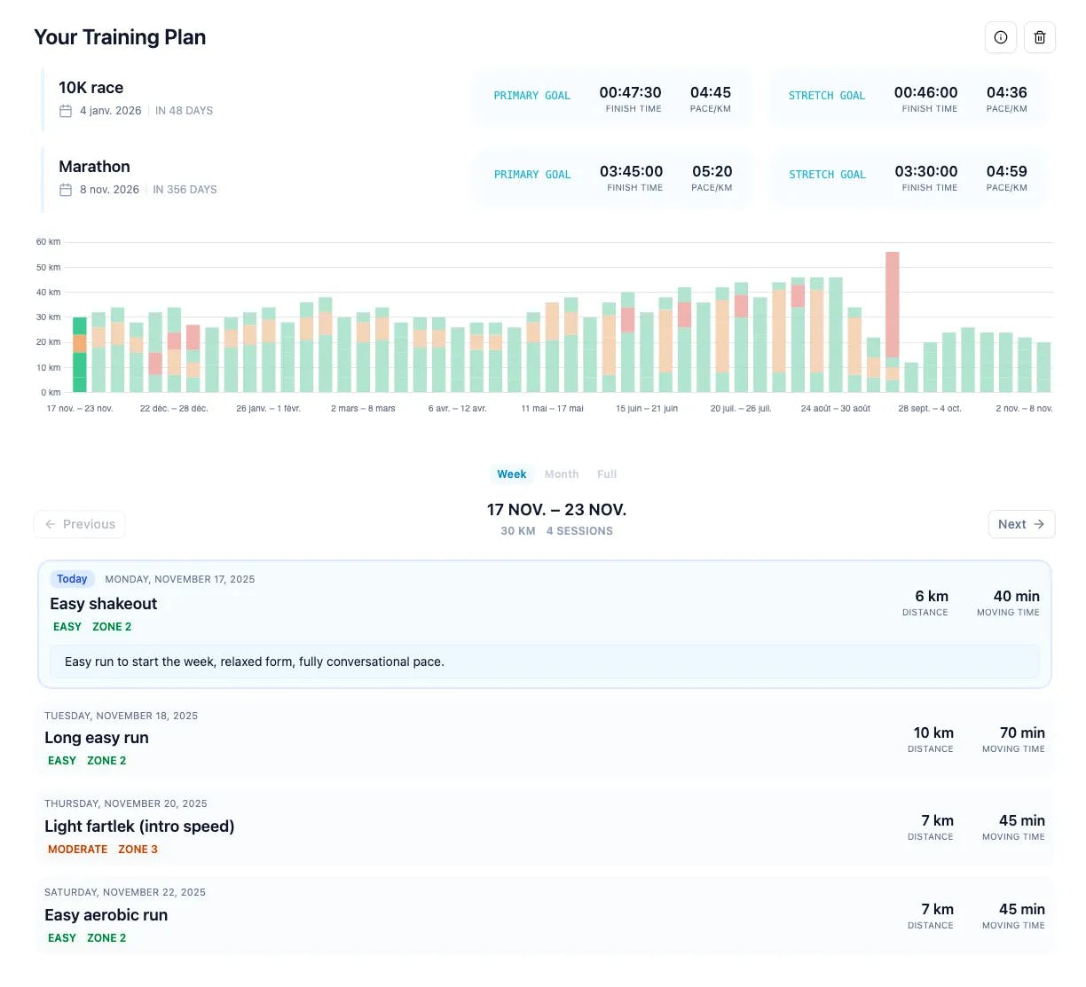 If you upgrade to Premium, you'll be able to plan for multiple goals, structure an entire running season (up to 18 months ahead), and ask your AI coach to update your plan at any time (whether you’re injured, missed a session, on vacation, or simply want more (or less) intensity, ...)