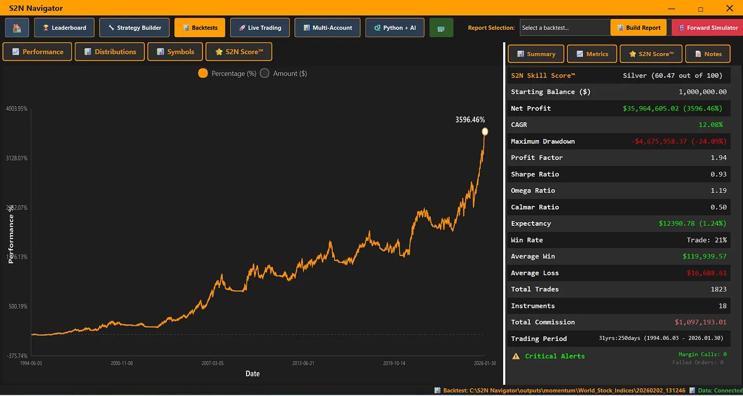 The total return is 3,596.46%, a CAGR of 12%, a Sharpe Ratio of 0.93 and a Silver level S2N Score of 60 achieved over 31 years. This is a robust strategy, not optimised over a few years and a few symbols. We have 18 in this portfolio.