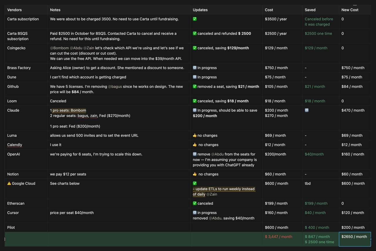 Oh well, talking about finance, we had to optimize our company burn rate to keep it alive, so this Thanksgiving tracking all the expenses and running some analysis I was able to save $1597/month + $2500 (see attached picture).