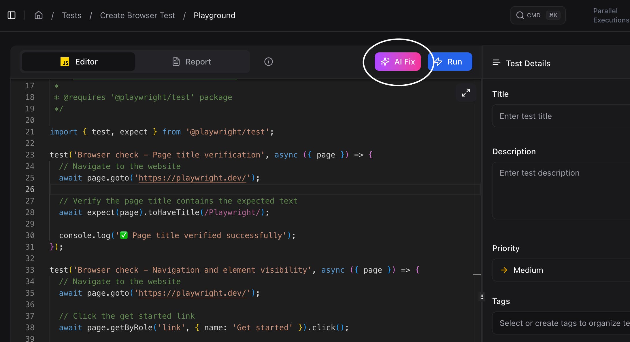 Our new AI Fix capability intelligently analyzes Playwright test failures and provides automated fix suggestions, dramatically reducing debugging time and keeping your CI/CD pipeline flowing smoothly.