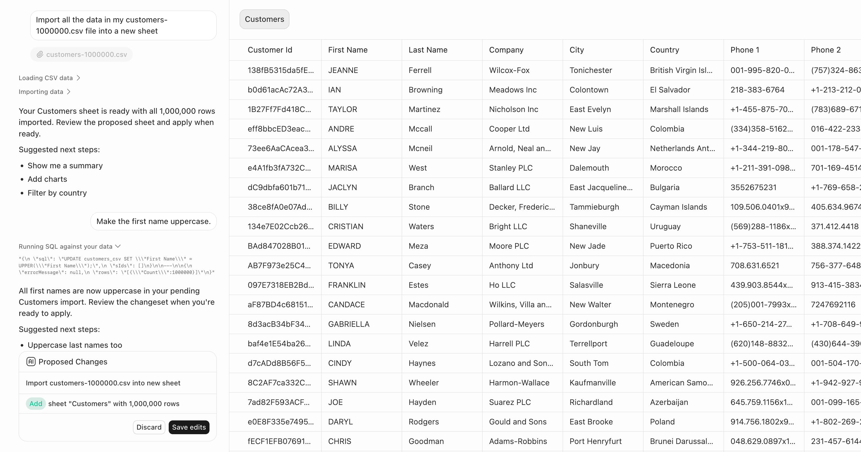 - You can talk to the agent to massage the data ("drop column x", "normalize column y"...). The agent runs actual SQL on your temporary table so that it can update millions of rows insanely fast without using AI tokens.