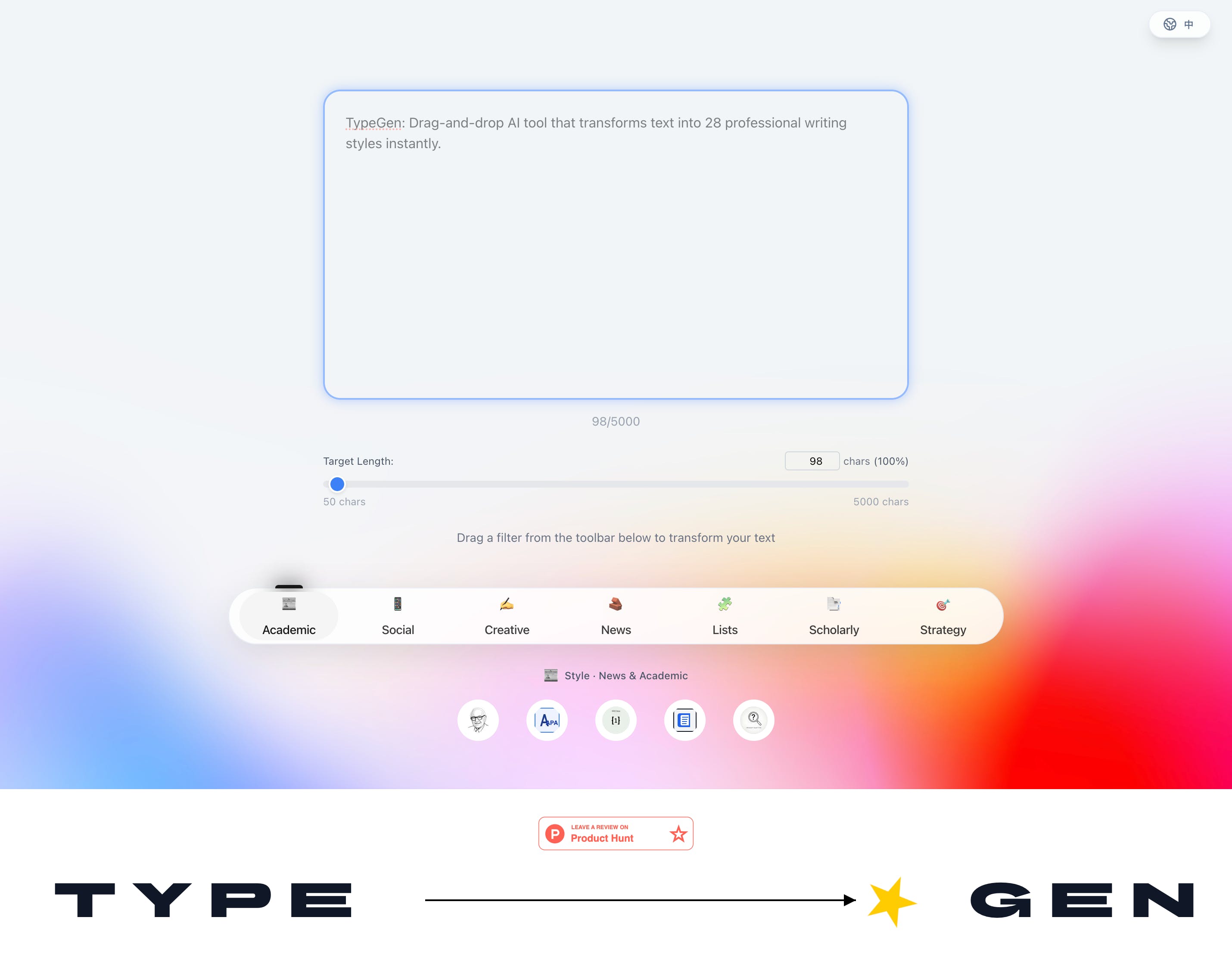TypeGen is an AI powered text styling workspace with 28 filters it helps you transform your article like using image filters.