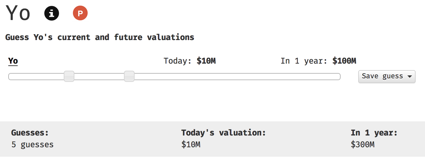 @rrhoover Also... about the problem with the data not being public. That's part of why I built this. There is information out there in many cases (# employees, amount raised, whispers on the streets) that could be reverse engineered into a valuation. Hopefully, by picking the median of the guesses (I haven't started weighing high confidence guesses more than low confidence ones, but will try when there's more data), I think we may actually approach a realistic "best guess" for this data. Wisdom of crowds, etc.