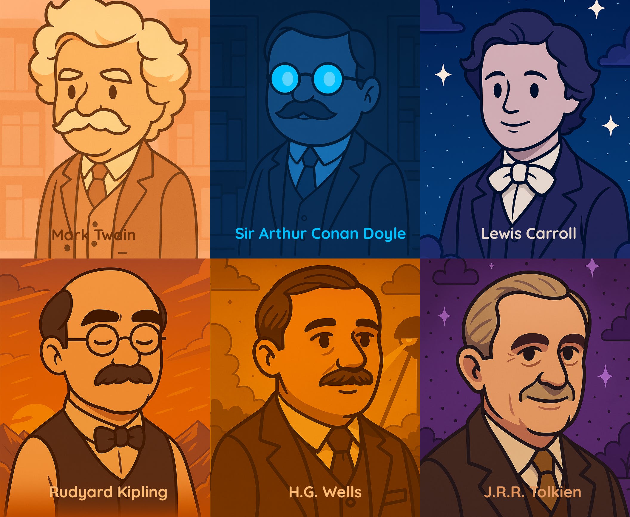 Switch from Magical Avatars to six literary voices: Mark Twain, Sir Arthur Conan Doyle, Lewis Carroll, Rudyard Kipling, H. G. Wells, J. R. R. Tolkien. Same vibe, new voice. Private and offline first. Weekly Scrolls shift to H. G. Wells. Homages only.