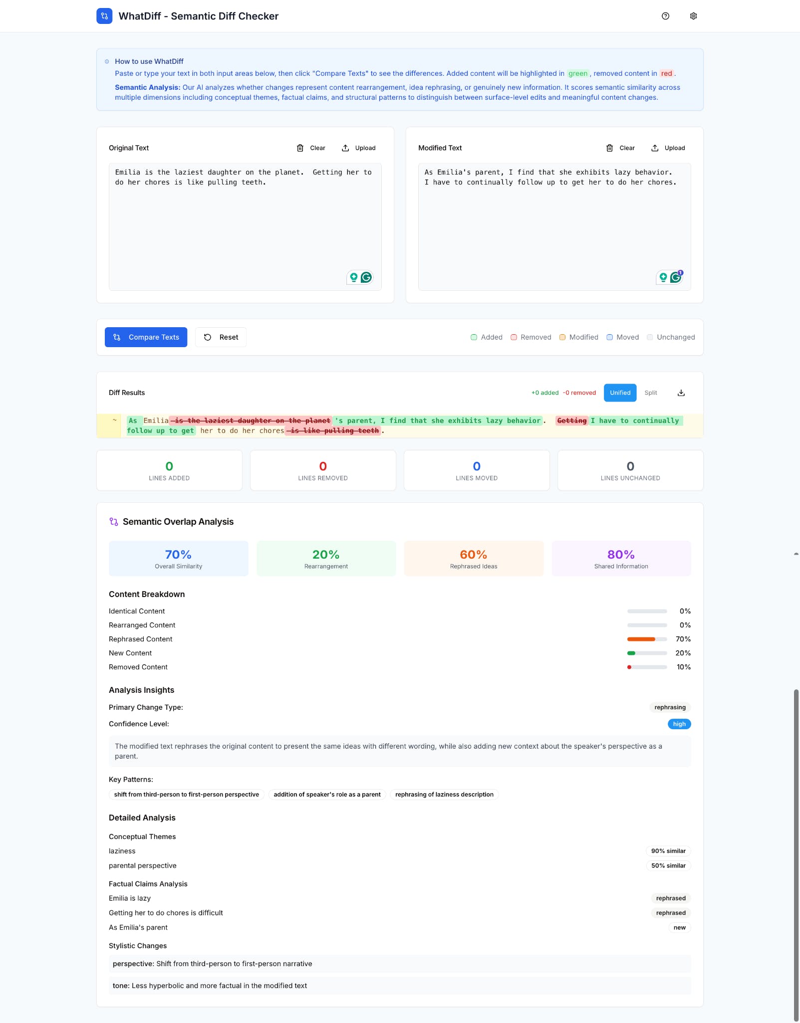 Free online semantic diff checker. AI-powered analysis + standard diff to pinpoint substantive changes and filter out mere rephrasing. Perfect for writers and developers.