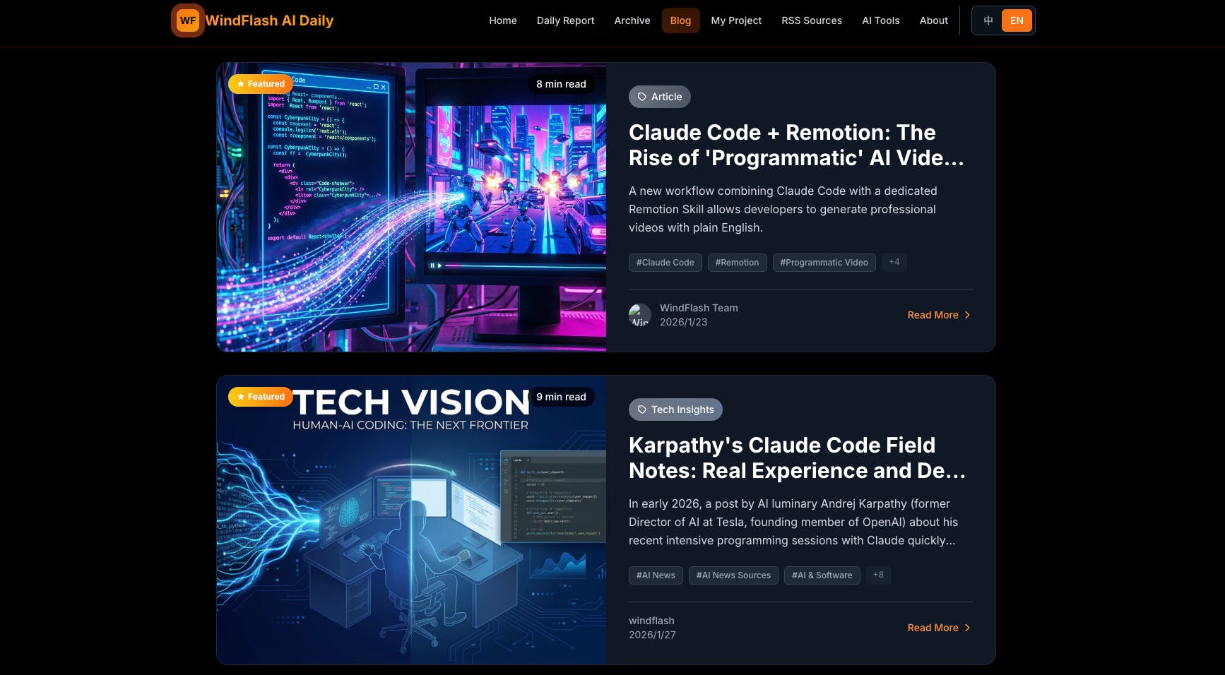 WindFlash is a daily curated AI digest covering LLM breakthroughs, agent updates, indie projects, deep dives, and community highlights. Features: topic sections, archives, yearly best‑of, RSS. Free for AI enthusiasts, developers, and researchers.