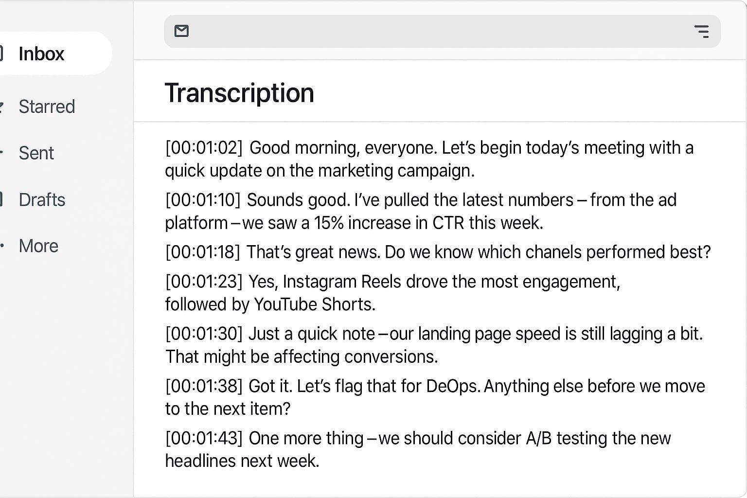 When we first introduced the transcription function, we intentionally kept it simple. The basic idea was clear: extract speech from audio and turn it into plain text. There were no speaker labels yet, just a time division of each line that was spoken. The email you see here shows how it worked. After downloading the recording, users would receive a full transcription to their mailbox. But the tool didn't distinguish between speakers yet - it just recorded everything like a tireless digital notepad.