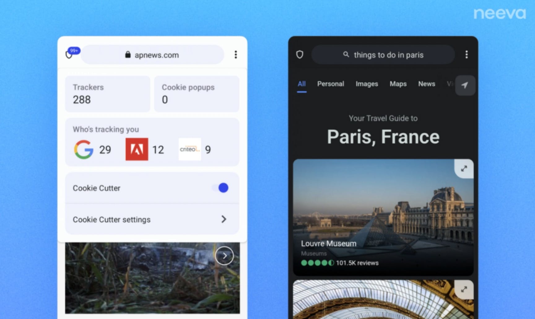 I work at Neeva, where our shared vision is to build a web that works better for all. Through the design of the Neeva browser and search engine, our team has been building toward that goal with features like FastTap search, Spaces, Cookie Cutter, and much more. I’m excited to share that we have now made this experience available to Android users.