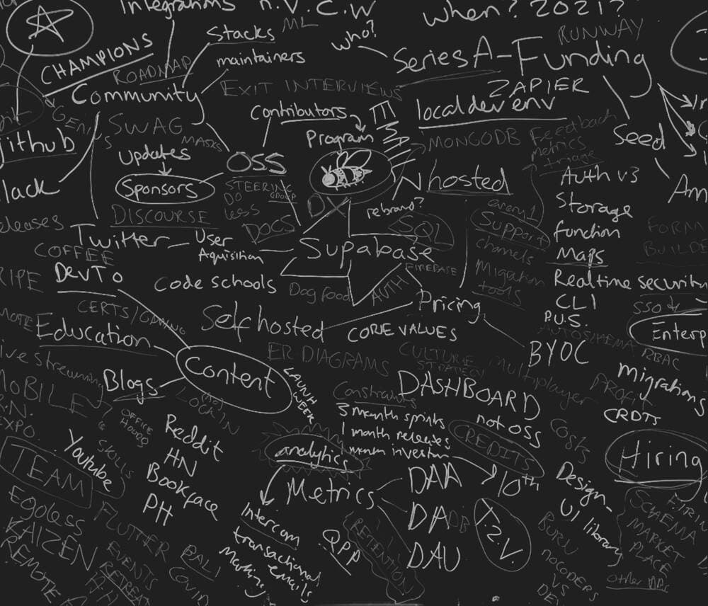 We always start the meeting by firing up a Google Jam Board and collectively constructing "The Supabase Universe", this is a giant brain dump of terms and concepts related to Supabase. What we're building, who it's for, who we're trying to hire, what our goals and metrics are. Literally everything that's anything to do with Supabase goes down on this virtual whiteboard. The purpose is to ensure everyone gets out of their daily mode of operation and loads up the business as a whole into their brains. Developers should be loading up marketing concepts, and the marketers should be thinking about engineering. If we're overly focused on one particular area (often engineering), then we risk setting a course in the wrong direction for the entire quarter. It's also a method of getting all the "obvious" stuff down on paper so you can move on and focus the creative efforts of everyone on new ideas; a technique borrowed from the creative industries.
